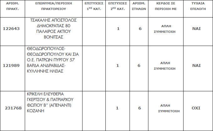 Επίσης, στην δεύτερη κατηγορία (5άρια) βρέθηκαν τρία (3) τυχερά δελτία, τα οποία κερδίζουν το ποσό των €34.905,48 έκαστο.