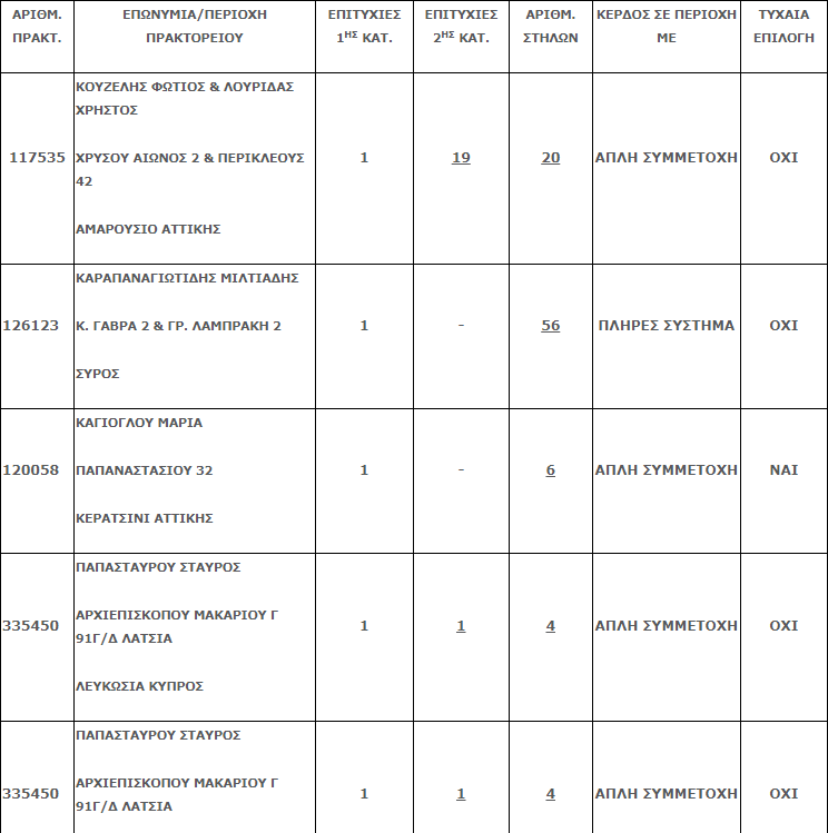 Επίσης, πενήντα έξι (56) τυχερά δελτία βρέθηκαν στην 2η κατηγορία (5) τα οποία κερδίζουν το ποσό των €4.886,30 έκαστο.
