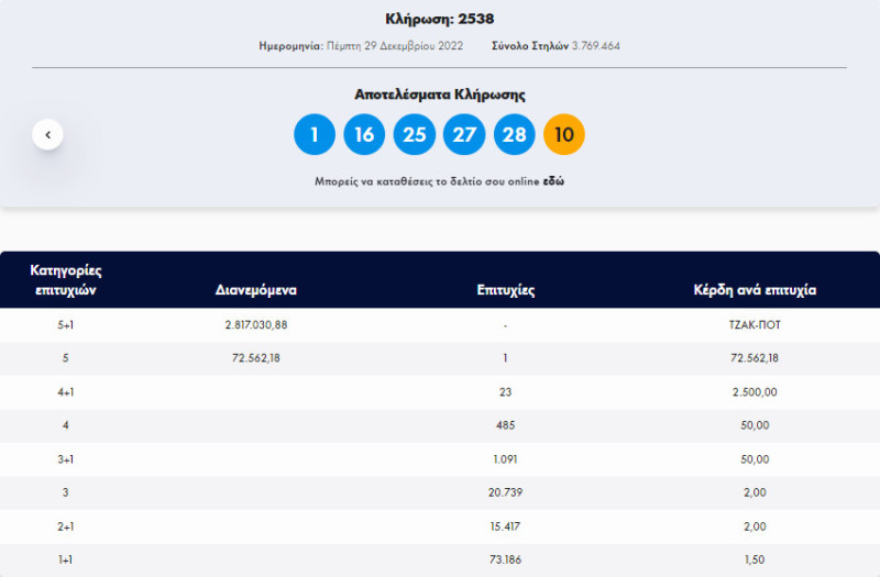 €3.500.000 τουλάχιστον θα μοιραστούν οι τυχεροί της 1ης κατηγορίας στην επόμενη κλήρωση την Κυριακής 1/1/2023 μετά το Τζακ-Ποτ που σημειώθηκε κατά τη σημερινή διαλογή της 2538ης κλήρωσης του Τζόκερ.