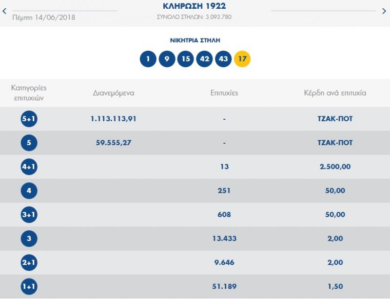 € 1.500.000 τουλάχιστον θα μοιραστούν οι τυχεροί της 1ης κατηγορίας στην επόμενη κλήρωση της ΚΥΡΙΑΚΗΣ 17/06/2018 μετά το ΤΖΑΚ-ΠΟΤ που σημειώθηκε κατά τη χθεσιή διαλογή της 1922ης κλήρωσης του ΤΖΟΚΕΡ.