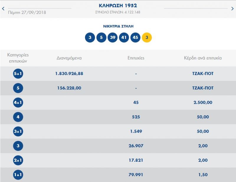 €2.400.000 τουλάχιστον θα μοιραστούν οι τυχεροί της 1ης κατηγορίας στην επόμενη κλήρωση της KYΡΙΑΚΗΣ 30/09/2018 μετά το ΤΖΑΚ-ΠΟΤ που σημειώθηκε κατά τη σημερινή διαλογή της 1952ης κλήρωσης του ΤΖΟΚΕΡ.