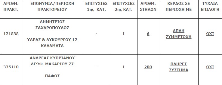 Επίσης στην δεύτερη κατηγορία (5άρια) βρέθηκαν δύο (2) επιτυχίες. Η κάθε επιτυχία κερδίζει το ποσό των € 23.442,13.