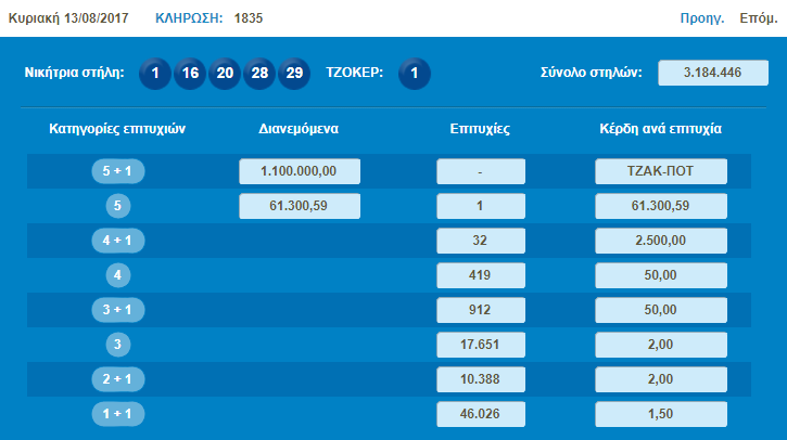 € 1.400.000 τουλάχιστον θα μοιραστούν οι τυχεροί της 1ης κατηγορίας στην επόμενη κλήρωση της ΠΕΜΠΤΗΣ 17/8/2017 μετά το ΤΖΑΚ-ΠΟΤ που σημειώθηκε κατά τη σημερινή διαλογή της 1835ης κλήρωσης του ΤΖΟΚΕΡ.