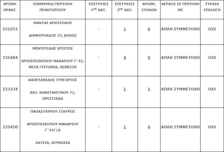 Επίσης στην δεύτερη κατηγορία (5άρια) βρέθηκαν τέσσερα (4) τυχερά δελτία, εκ των οποίο το ένα φέρει 4 επιτυχίες, και τα οποία κερδίζουν το ποσό των €15.111,58 για κάθε επιτυχία.
