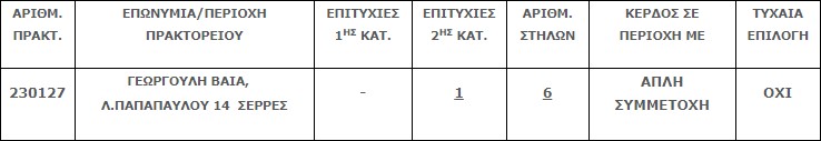 Επίσης στην δεύτερη κατηγορία (5άρια) βρέθηκε μία (1) επιτυχία που κερδίζει το ποσό των €79.542,89.