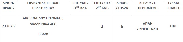 Επίσης, ένα (1) τυχερό δελτίο βρέθηκε στην 2η κατηγορία (5) το οποίο κερδίζει το ποσό των €61.558,15.