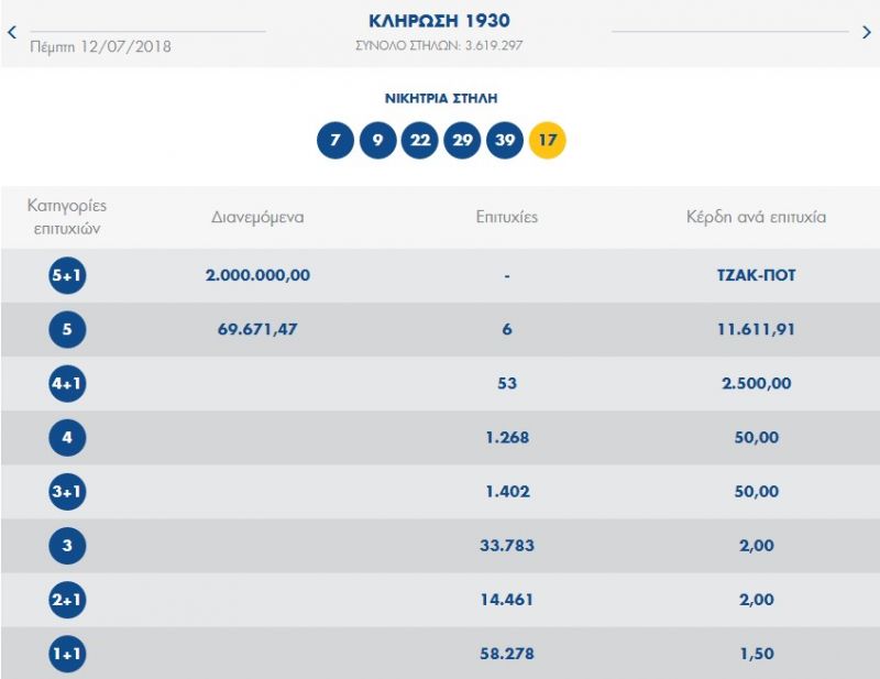 €2.500.000 τουλάχιστον θα μοιραστούν οι τυχεροί της 1ης κατηγορίας στην επόμενη κλήρωση της ΚΥΡΙΑΚΗΣ 15/07/2018 μετά το ΤΖΑΚ-ΠΟΤ που σημειώθηκε κατά τη σημερινή διαλογή της 1930ης κλήρωσης του ΤΖΟΚΕΡ.