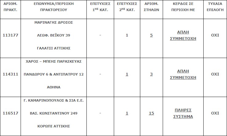 Επίσης στην δεύτερη κατηγορία (5άρια) βρέθηκαν έξι (6) επιτυχίες . Η κάθε επιτυχία κερδίζει το ποσό των € 8.823,41.