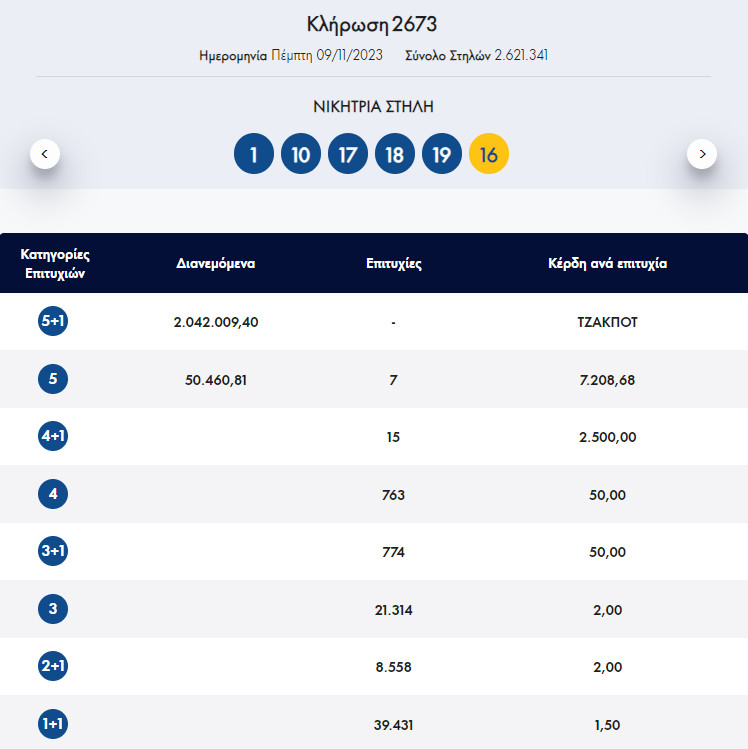 €2.500.000 τουλάχιστον θα μοιραστούν οι τυχεροί της 1ης κατηγορίας στην επόμενη κλήρωση της Κυριακής, 12 Νοεμβρίου 2023 μετά το Τζακ-Ποτ που σημειώθηκε κατά τη διαλογή της 2673ης κλήρωσης του Τζόκερ.