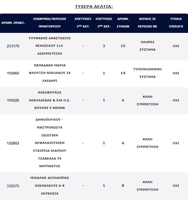 Επίσης, στη δεύτερη κατηγορία (5άρια) βρέθηκαν έφτα (1) τυχερά δελτίο, τα οποία κερδίζουν το ποσό των €7.208,68 για κάθε επιτυχία.