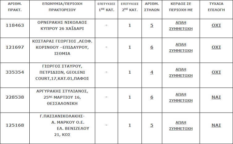 Επίσης στην δεύτερη κατηγορία (5άρια) βρέθηκαν πέντε (5) τυχερά δελτία που κερδίζουν το ποσό των €19.256,09 έκαστο.