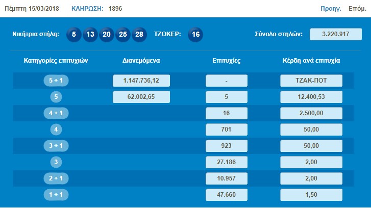 €1.600.000 τουλάχιστον θα μοιραστούν οι τυχεροί της 1ης κατηγορίας στην επόμενη κλήρωση της ΚΥΡΙΑΚΗΣ 18/03/2018 μετά το ΤΖΑΚ-ΠΟΤ που σημειώθηκε κατά τη σημερινή διαλογή της 1896ης κλήρωσης του ΤΖΟΚΕΡ.