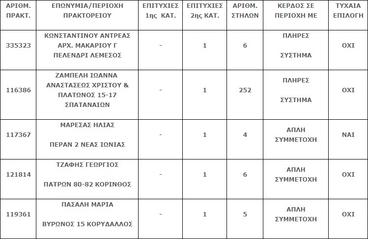 Επίσης στην δεύτερη κατηγορία (5άρια) βρέθηκαν πέντε (5) τυχερά δελτία, τα οποία κερδίζουν το ποσό των€12.400,53 έκαστο.