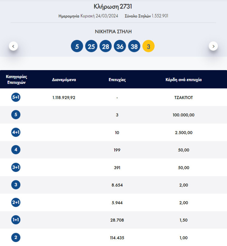 €1.300.000 τουλάχιστον θα μοιραστούν οι τυχεροί της 1ης κατηγορίας στην επόμενη κλήρωση της Τρίτης, 26 Μαρτίου 2024 μετά το Τζακ-Ποτ που σημειώθηκε κατά τη διαλογή της 2731ης κλήρωσης του Τζόκερ.