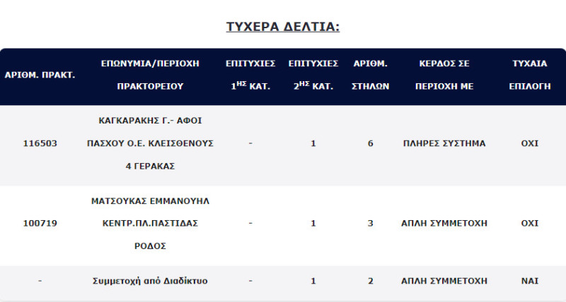 Επίσης, τρία (3) τυχερά δελτία βρέθηκαν στην 2η κατηγορία (5), τα οποία κερδίζουν το ποσό των €100.000,00 για κάθε επιτυχία.