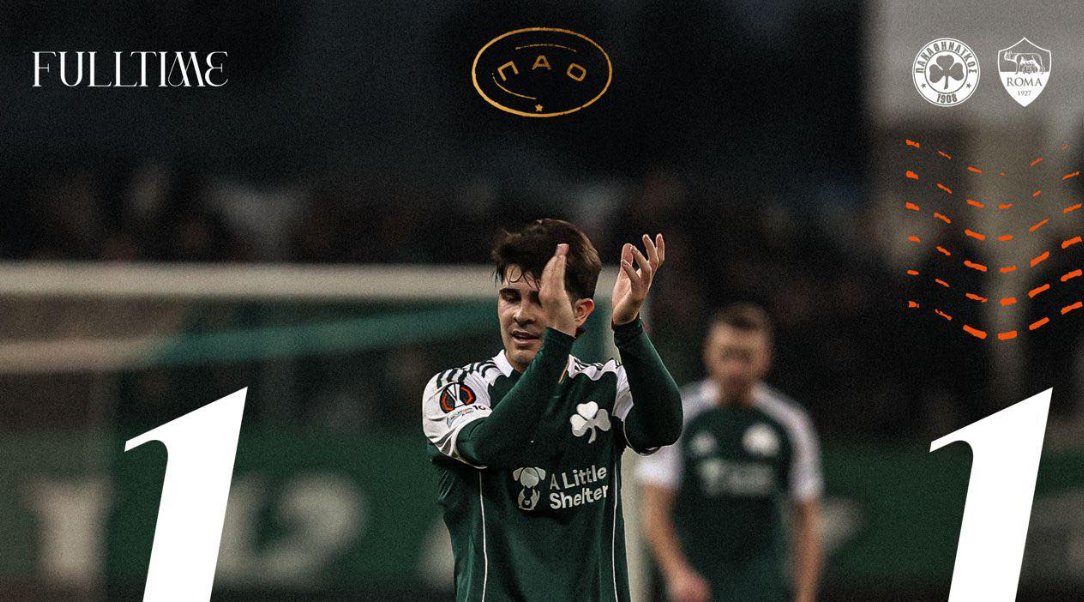 Ο Παναθηναϊκός στάθηκε όρθιος απέναντι στη Ρόμα, κοίταξε στα ίσια ένα μεγάλο ευρωπαϊκό όνομα, όμως τελικά έμεινε στο 1-1 στο Ο.Α.Κ.Α., ολοκληρώνοντας με θετικό αποτύπωμα τη League Phase του Europa League.