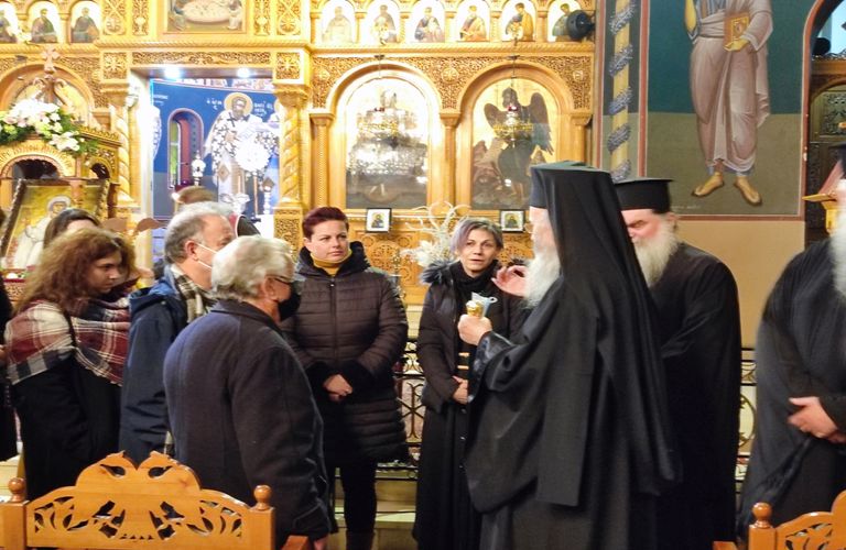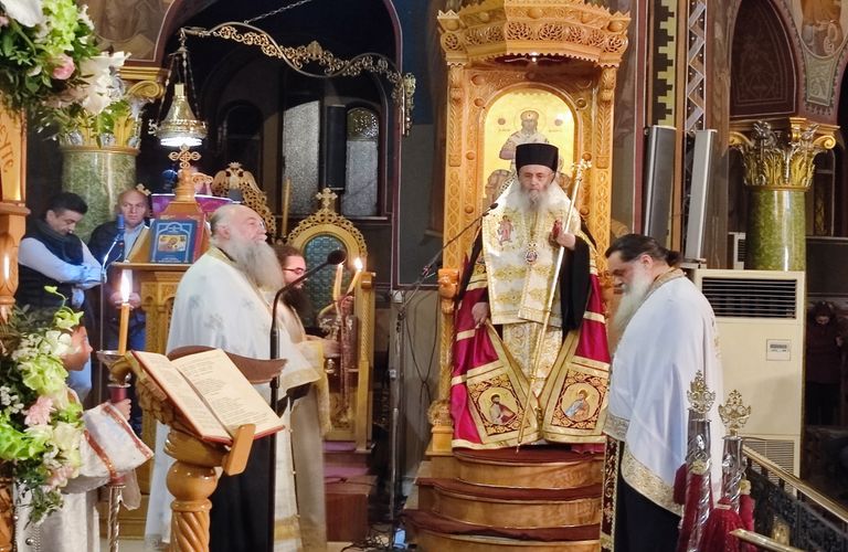 Ο Σεβασμιώτατος έψαλλε τους οίκους ενώπιον της εικόνας της Θεοτόκου και κήρυξε τον θείο λόγο στους πιστούς ερμηνεύοντας τον στίχο από την ζ’ ωδή του κανόνος: «Ἰατῆρα τῶν ἀνθρώπων ἡ κυήσασα, χαῖρε, Θεόνυμφε».