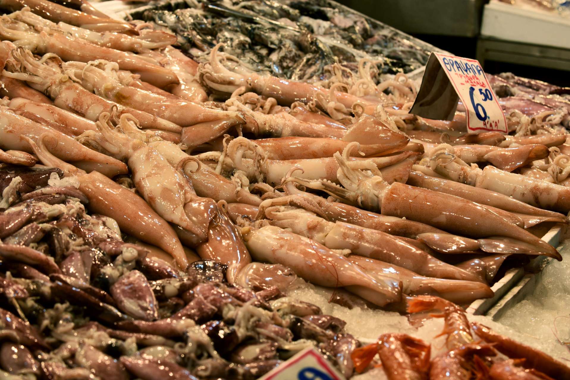 Στα 8-9 ευρώ από 10 -11 ευρώ που ήταν πέρυσι τιμάται η σκούρα γαρίδα Εκουαδόρ (μεσαίο μέγεθος) , τα 12 ευρώ αγγίζει η κόκκινη γαρίδα Αργεντινής, τα καλαμάρια κοστίζουν 8.98 ευρώ, περίπου δύο ευρώ κάτω από την περυσινή τιμή και τα πλοκάμια θράψαλου στα 7.98 είναι φθηνότερα κατά 1 ευρώ από πέρυσι.