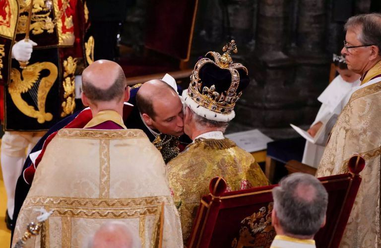 Αφού σηκώθηκε και ακούμπησε το στέμμα του Βασιλιά, ο Πρίγκιπας Γουίλιαμ έσκυψε και φίλησε τον πατέρα του στο μάγουλο.