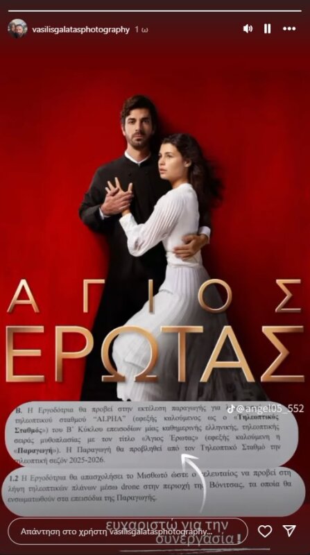 Ο Βασίλης Γαλατάς, αεροκινηματογραφιστής από το Αγρίνιο, εντάσσει τη δημιουργική του ματιά στη νέα τηλεοπτική σειρά «Άγιος Έρωτας», που αναμένεται να κερδίσει το ενδιαφέρον του κοινού.