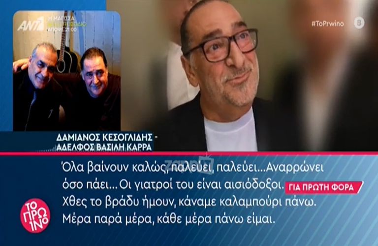 Ο Βασίλης Καρράς δίνει το τελευταίο διάστημα μια γενναία «μάχη» για την υγεία του. Ο αδελφός του τραγουδιστή μίλησε στο «Πρω1νό» και τον Θάνο Βάγιο και περιέγραψε ακριβώς πώς έχουν τα πράγματα σήμερα.