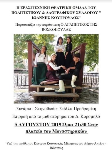Την Δευτέρα 5 Αυγούστου η ερασιτεχνική θεατρική ομάδα του Συλλόγου Μοναστηρακίου “Ιωάννης Κουτρουλός”, θα παρουσιάσει την παράσταση «Ο Αγαπητικός της Βοσκοπούλας», στις 21:30 μ.μ., στην πλατεία Μοναστηρακίου του Δήμου Ακτίου Βόνιτσας.