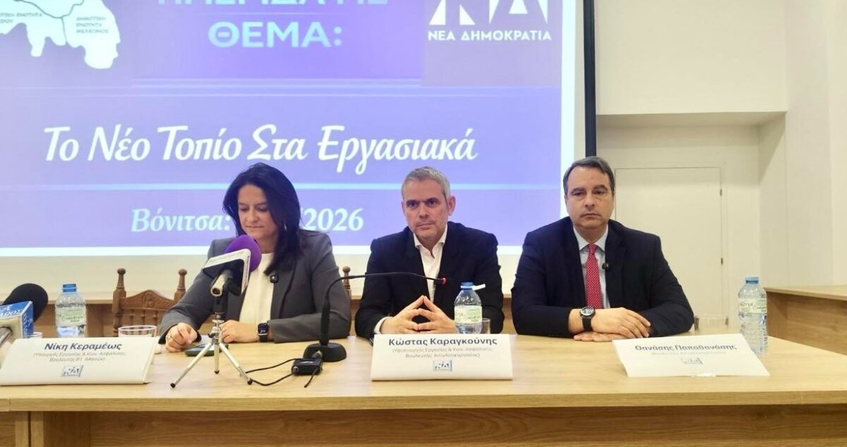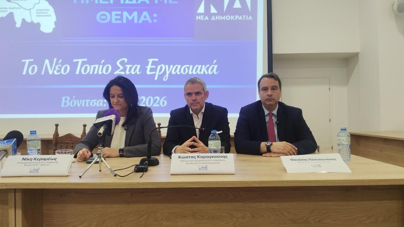 Στη Βόνιτσα συμμετείχαν το Σάββατο, 21 Μαρτίου 2026 η Υπουργός Εργασίας Νίκη Κεραμέως και ο Υφυπουργός Κώστας Καραγκούνης σε Ημερίδα για τις αλλαγές στα Εργασιακά.