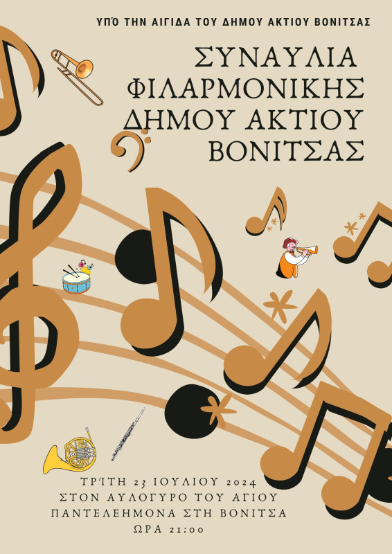 Συναυλία θα πραγματοποιήσει την Τρίτη, 23 Ιουλίου 2024 η Φιλαρμονική του Δήμου Ακτίου-Βόνιτσας, στις 21:00, στον αυλόγυρο της Εκκλησίας του Αγίου Παντελεήμονα στη Βόνιτσα.