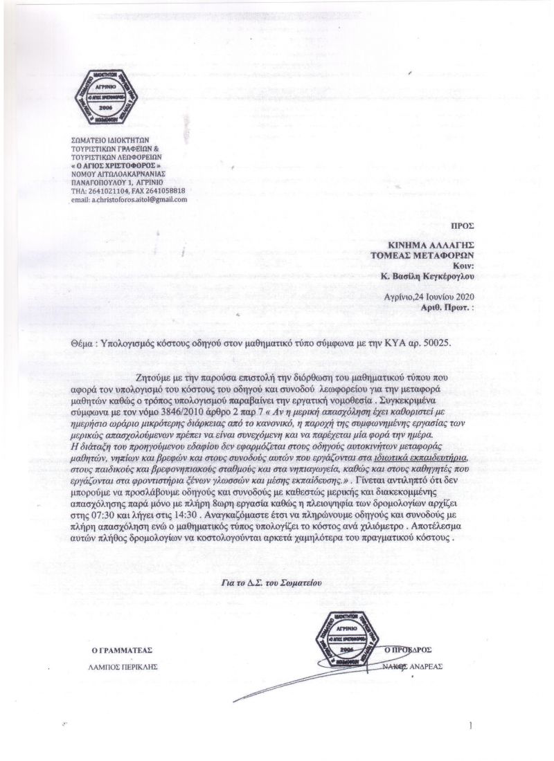 Σας καταθέτουμε την επιστολή του Σωματείου Ιδιοκτητών Τουριστικών Γραφείων & Τουριστικών Λεωφορείων «ο Άγιος Χριστόφορος» με την οποία αιτούνται την διόρθωση του μαθηματικού τύπου υπολογισμού του κόστους οδηγού και συνοδού λεωφορείου κατά τη μεταφορά μαθητών, καθώς δεν είναι εφικτό να προσλαμβάνονται οδηγοί μερικής απασχόλησης εφόσον τα δρομολόγια πραγματοποιούνται από τις 07:30 έως τις 14:30.