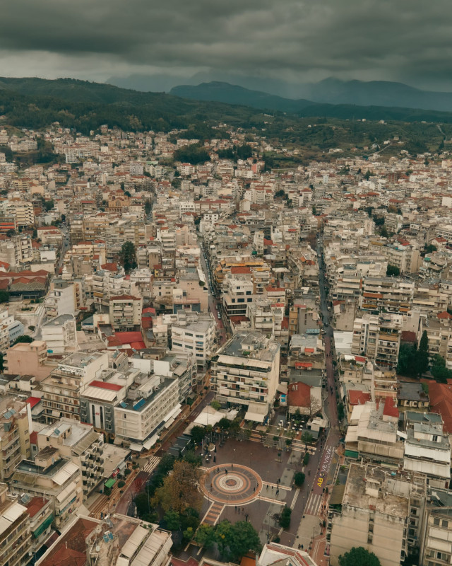 Η κεντρική πλατεία της πόλης του Αγρινίου με φόντο την Ακρόπολη Θεστιέων και το Παναιτωλικό Όρος.