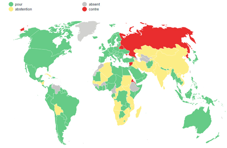Αυτά, ανάμεσα στα άλλα, περιλαμβάνονται στο ψήφισμα που εγκρίθηκε με μεγάλη πλειοψηφία στην έκτακτη γενική συνέλευση του ΟΗΕ, το απόγευμα της Τετάρτης. Υπέρ ψήφισαν 141 από τα 193 κράτη-μέλη, ενώ 35 απείχαν ή απουσίαζαν και 5 καταψήφισαν – Λευκορωσία, Βόρειος Κορέα, Ερυθραία και Συρία.