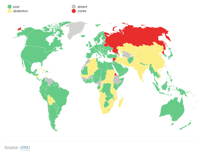 Αυτά, ανάμεσα στα άλλα, περιλαμβάνονται στο ψήφισμα που εγκρίθηκε με μεγάλη πλειοψηφία στην έκτακτη γενική συνέλευση του ΟΗΕ, το απόγευμα της Τετάρτης. Υπέρ ψήφισαν 141 από τα 193 κράτη-μέλη, ενώ 35 απείχαν ή απουσίαζαν και 5 καταψήφισαν – Λευκορωσία, Βόρειος Κορέα, Ερυθραία και Συρία.
