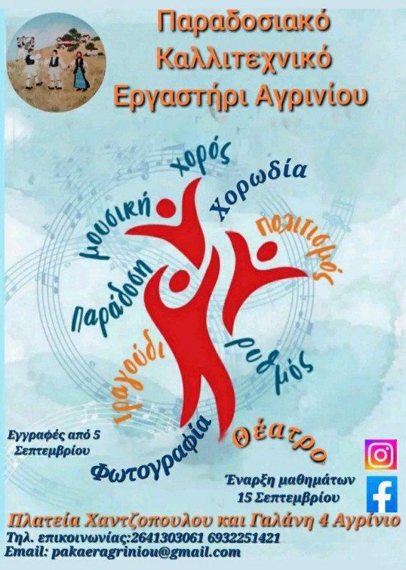 Ξεκινούν τα μαθήματα χορού, θεάτρου, φωτογραφίας και χορωδίας στο Παραδοσιακό Καλλιτεχνικό Εργαστήρι Αγρινίου.