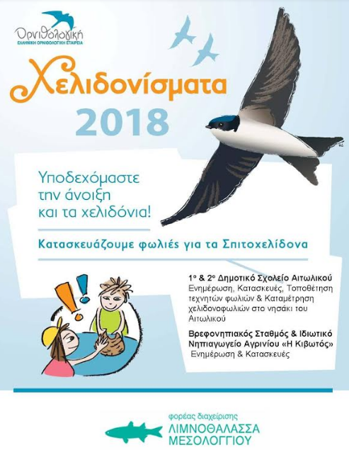 Στα πλαίσια της εκδήλωσης, ο Φορέα Διαχείρισης Λιμνοθάλασσας Μεσολογγίου – Ακαρνανικών Ορέων διοργάνωσε ενημερωτικές επισκέψεις στο 1ο και στο 2ο Δημοτικό Σχολείο Αιτωλικού. Οι μικροί μας φίλοι αρχικά παρακολούθησαν δύο παρουσιάσεις σε powerpoint, της Ελληνικής Ορνιθολογικής Εταιρείας και του Φορέα Διαχείρισης, για τα πέντε είδη χελιδονιών που επισκέπτονται κάθε χρόνο την Ελλάδα και τις απειλές που αντιμετωπίζουν στο δύσκολο ταξίδι τους από την Αφρική. Στην συνέχεια ιδιαίτερη έμφαση δόθηκε στον τρόπο προσδιορισμού στην ύπαιθρο των διαφορετικών ειδών χελιδονιών, μέσα από την χρήση οπτικοακουστικού υλικού. Τέλος μοιράστηκαν στους μαθητές σελίδες ζωγραφικής με χελιδόνια καθώς και υλικό για το μάθημα εικαστικών (οδηγίες σχεδιασμού χελιδονιών βήμα προς βήμα και το πατρόν της Ελληνικής Ορνιθολογικής Εταιρείας για κατασκευή χελιδονοφωλιών από πηλό).
