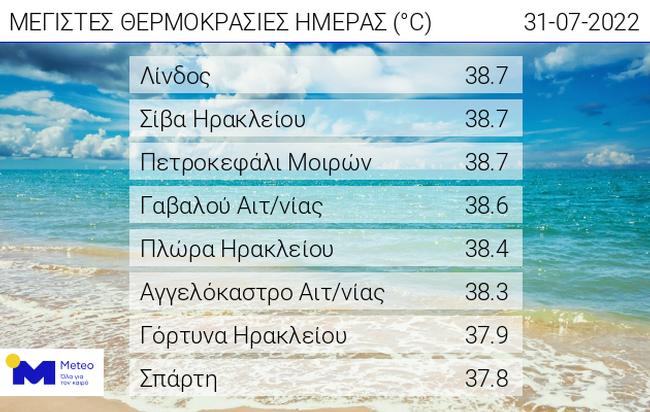 Συγκεκριμένα, την Κυριακή 31/07 οι υψηλότερες μέγιστες θερμοκρασίες καταγράφτηκαν σε Λίνδο Ρόδου, Σίβα Ηρακλείου και Πετροκεφάλι Μοιρών με 38,7 °C. Πολύ υψηλές θερμοκρασίες είχαμε και σε περιοχές της Αιτωλοακαρνανίας.