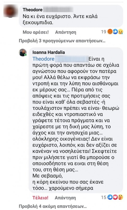 Η Ιωάννα Χαρδαλιά, κόρη του υφυπουργού Πολιτικής Προστασίας, απάντησε σε σχόλιο χρήστη του διαδικτύου που φαίνεται πως χάρηκε με την περιπέτεια υγείας του υφυπουργού Πολιτικής Προστασίας.