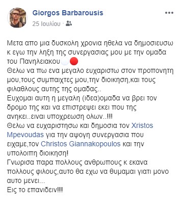 Να σημειώσουμε πως πριν μερικά 24ωρα ο ίδιος ο Αιτωλοακαρνάνας ποδοσφαιριστής με δημόσια ανάρτηση στον προσωπικό του λογαριασμό στο facebook είχε ευχαριστήσει την προηγούμενη ομάδα του, τον Πανηλειακό.