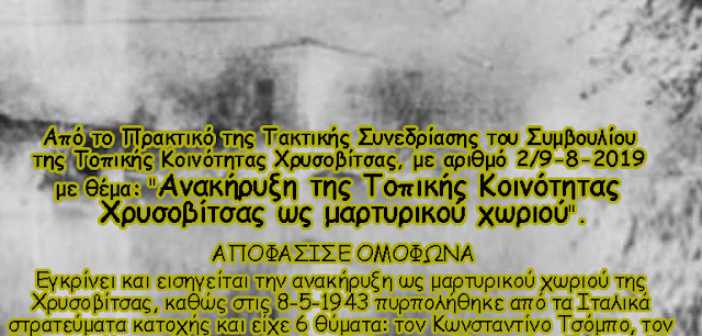 Ο Πρόεδρος του χωριού Γιάννης Χρόνης και το τοπικό συμβούλιο, πήραν απόφαση, η οποία θα συζητηθεί στο δημοτικό συμβούλιο Ξηρομέρου και από εκεί θα αποσταλούν στο Υπουργείο Εσωτερικών, ευελπιστώντας να επιτευχθεί ο στόχος και να δικαιωθεί η μνήμη των εκτελεσθέντων Χρυσοβιτσάνων. Η αναγνώριση του χωριού ως Μαρτυρικό αποτελεί πάγιο αίτημα όλων των κατοίκων του χωριού