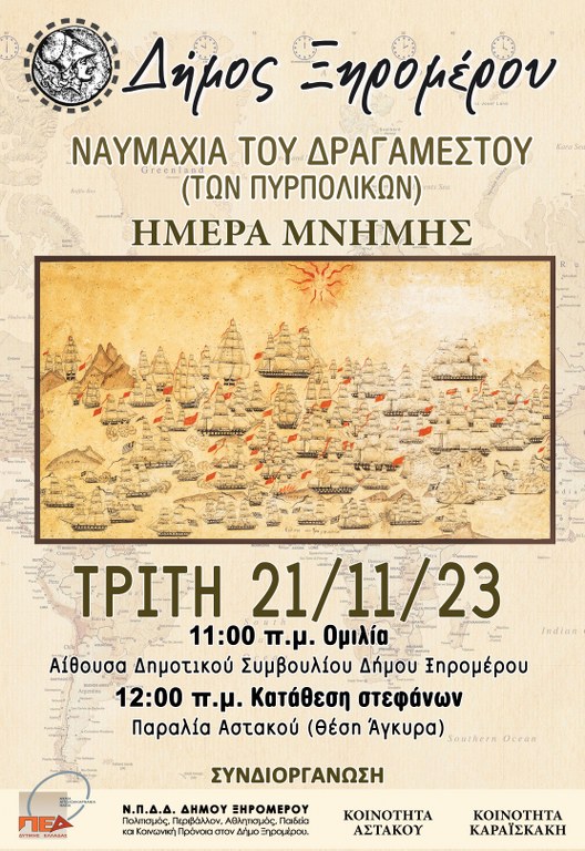 Την Τρίτη, 21 Νοεμβρίου 2023 και ώρα 11 το πρωί στην αίθουσα του Δημοτικού Συμβουλίου θα πραγματοποιηθεί ομιλία και μία ώρα αργότερα στις 12 το μεσημέρι κατάθεση στεφάνων στην Παραλία Αστακού (θέση Άγκυρα), για τη «Ναυμαχία του Δραγαμέστου» (των Πυρπολικών).