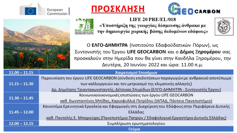Ο ΕΛΓΟ-ΔΗΜΗΤΡΑ (Ινστιτούτο Εδαφοϋδατικών Πόρων), ως συντονιστής του έργου LIFE GEOCARBON και ο Δήμος Ξηρομέρου, σας προσκαλούν στην Ημερίδα που θα γίνει στην Κανδήλα Ξηρομέρου, την Δευτέρα 20 Ιουνίου 2022 και ώρα 11:00 π.μ.