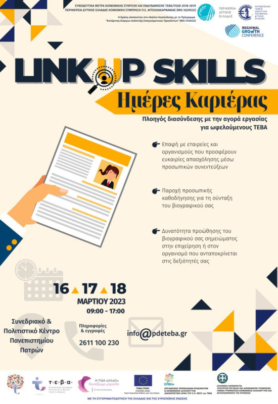 Στο πλαίσιο υλοποίησης Συνοδευτικών Μέτρων της Περιφέρειας Δυτικής Ελλάδας, θα πραγματοποιηθεί στις 16, 17 και 18 Μαρτίου 2023 στο Συνεδριακό Κέντρο του Πανεπιστημίου Πατρών, η εκδήλωση «Link Up Skills» – Ημέρες Καριέρας για ωφελούμενους Τ.Ε.Β.Α. της Περιφέρειας Δυτικής Ελλάδας.