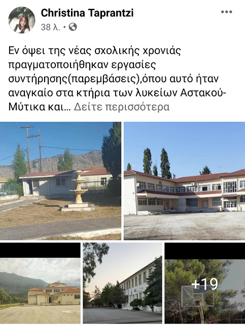 Η Πρόεδρος της Σχολικής Επιτροπής Δευτεροβάθμιας Εκπαίδευσης κ. Χριστίνα Ταπραντζή σε ανάρτηση που έκανε στο προσωπικό της προφίλ facebook αναφέρει ότι στακτήρια των λυκείων Αστακού-Μύτικα και των γυμνασίων Κάνδηλας-Φυτειών έγιναν εργασίες και απολυμάνσεις και όλα είναι έτοιμα να υποδεχθούν την δευτέρα τους μαθητές για τη νέας σχολική χρονιά.