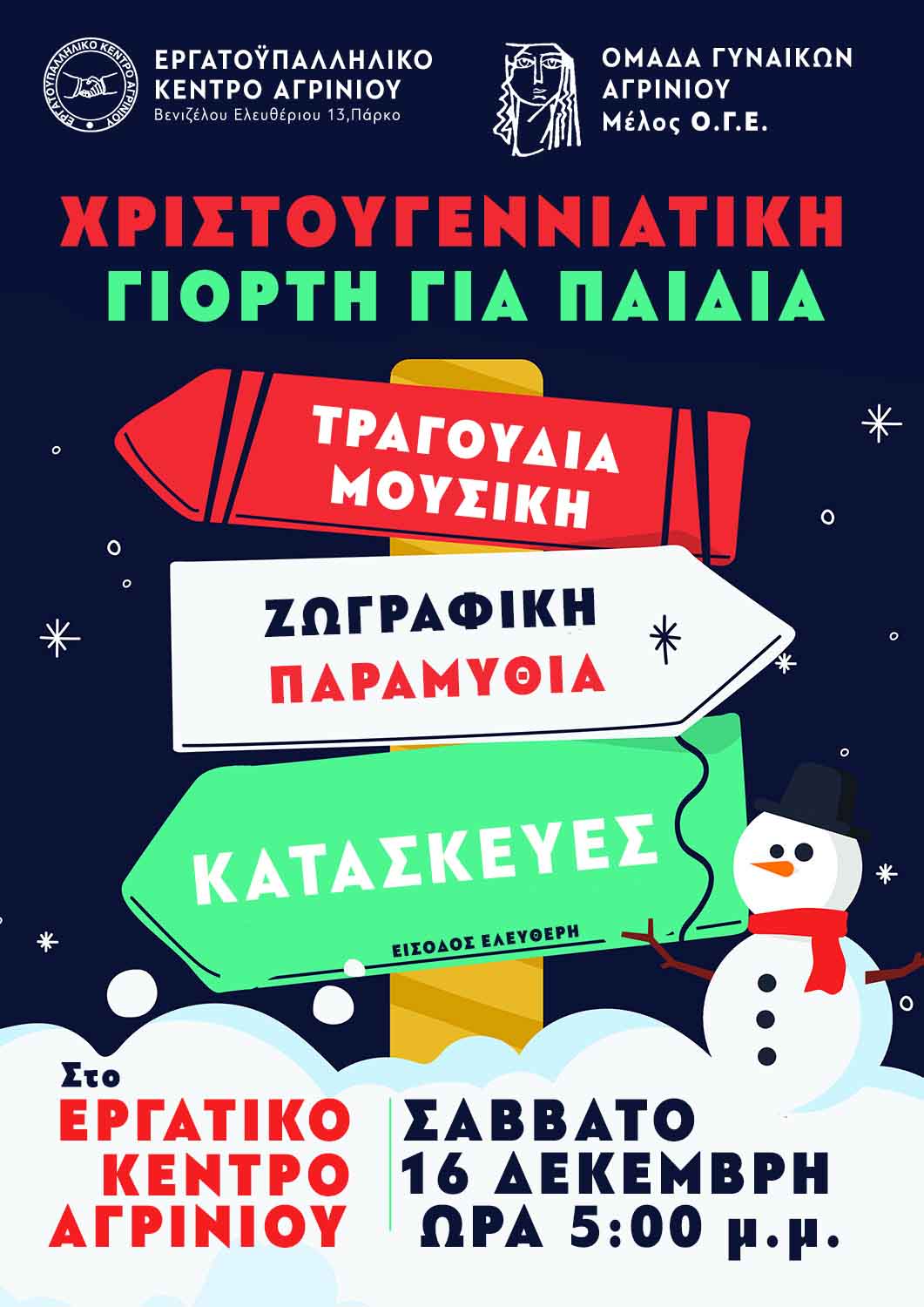 Το Σάββατο, 16 Δεκεμβρίου στις 5 το απόγευμα στο Εργατικό Κέντρο Αγρινίου θα πραγματοποιηθεί Χριστουγεννιάτικη εκδήλωση για παιδιά