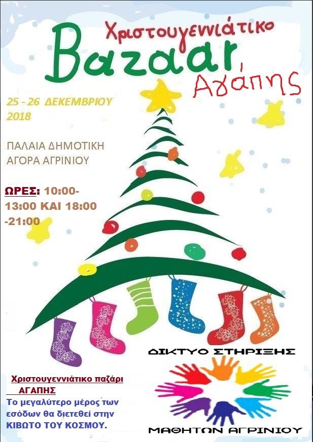 Το Δίκτυο Στήριξης Μαθητών Αγρινίου, ενόψει των εορτών, θα πραγματοποιήσει διήμερο χριστουγεννιάτικο bazaar αγάπης για φιλανθρωπικό σκοπό, τα έσοδα του οποίου θα διατεθούν για ενίσχυση οικονομικά αδύνατων μαθητών της περιοχής μας και μέρος των εσόδων αυτών θα προσφερθεί στην «κιβωτό του κόσμου» και συγκεκριμένα για τα παιδιά που φιλοξενούνται στο σπίτι της ορεινής και ακριτικής Πωγωγιανής Ιωαννίνων.