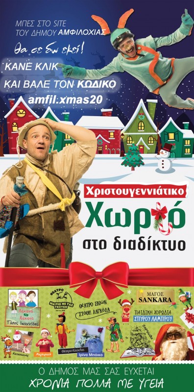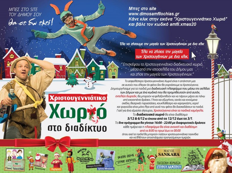 Στο Δήμο Αμφιλοχίας, μπορεί τα φετινά Χριστούγεννα να είναι διαφορετικά αλλά θα είναι εξίσου εντυπωσιακά! Αξιοποιώντας τις δυνατότητες της τεχνολογίας και του διαδικτύου, όλα τα παιδιά του Δήμου μας θα έχουν τη δυνατότητα μέσα από τον υπολογιστή τους, το τάμπλετ ή το κινητό τους, να ταξιδέψουν στο μοναδικό Χριστουγεννιάτικο Διαδικτυακό anti-covid Χωριό που έχει στηθεί στην ιστοσελίδα μας. Ανοίγοντας τη σελίδα www.dimosamfilochias.gr, κάνοντας «κλικ» στην εικόνα «Χριστουγεννιάτικο Χωριό στο Διαδίκτυο» και χρησιμοποιώντας τον κωδικό amfil.xmas20, μικροί και μεγάλοι μπορούν να απολαύσουν με ασφάλεια ένα πλούσιο και διασκεδαστικό θέαμα εντελώς δωρεάν, που προσφέρει το Κέντρο Κοινωνικής Ανάπτυξης του Δήμου Αμφιλοχίας.