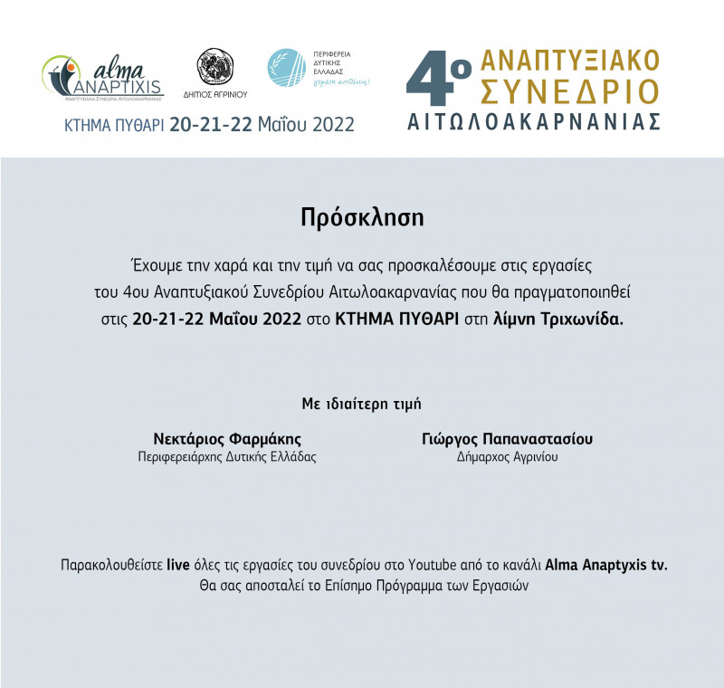 Ακολουθεί αναλυτικά το Πρόγραμμα Εργασιών και Εκδηλώσεων του 4ου Αναπτυξιακού Συνεδρίου Αιτωλοακαρνανίας Λίμνη Τριχωνίδα «Κτήμα Πιθάρι», 20-21-22 Μαΐου 2022.