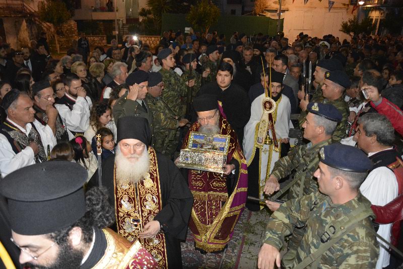Το ιερό κειμήλιο μετέφερε ο πανοσιολογιώτατος Καθηγούμενος Γέροντας Εφραίμ και υποδέχθηκε στην πλατεία Τρικούπη, έμπροσθεν του μουσείου οικίας Χαριλάου Τρικούπη, ο Σεβασμιώτατος Ποιμενάρχης, Μητροπολίτης Αιτωλίας και Ακαρνανίας κ. Κοσμάς, επικεφαλής του ιερού κλήρου και του ευσεβούς λαού, παρουσία των πολιτειακών και στρατιωτικών αρχών.