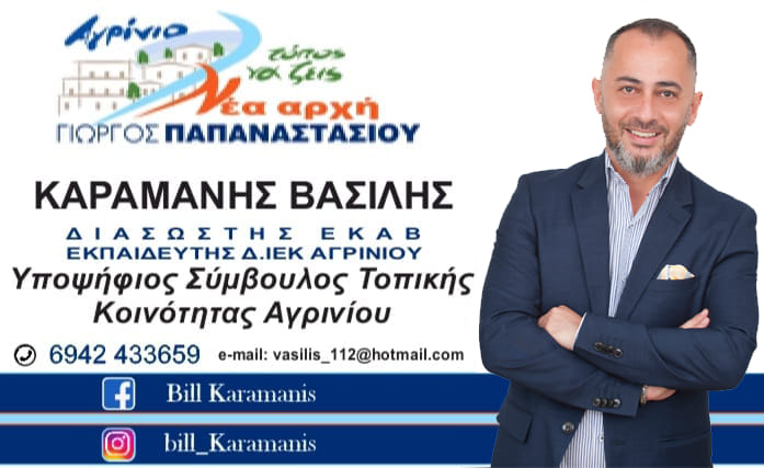 Υποψήφιος με τον Συνδυασμό «Αγρίνιο -Νέα αρχή- Τόπος να ζεις» του Δήμαρχου Αγρινίου, Γιώργου Παπαναστασίου θα είναι στις Αυτοδιοικητικές Εκλογές της 8ης Οκτωβρίου ο Βασίλης Καραμάνης.