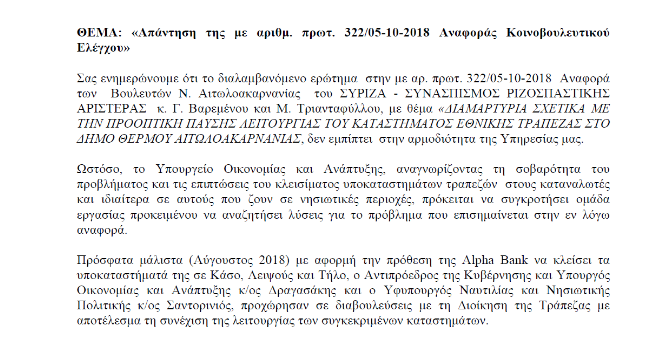 Απάντηση στην αναφορά που είχαν καταθέσει στη Βουλή οι βουλευτές Αιτωλοακαρνανίας του ΣΥ.ΡΙΖ.Α., Μαρία Τριανταφύλλου και Γιώργος Βαρεμένος, σχετικά με το επικείμενο κλείσιμο του υποκαταστήματος της Εθνικής Τράπεζας Θέρμου, έδωσε το Υπουργείο Οικονομίας και Ανάπτυξης.