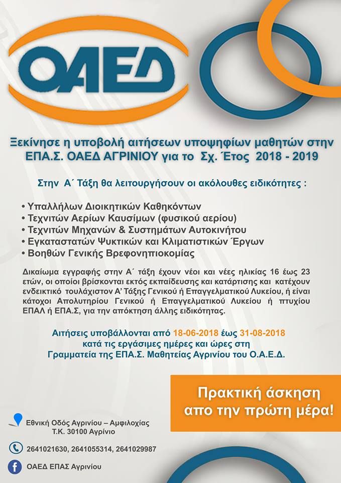 Από την ΕΠΑ.Σ Μαθητείας Αγρινίου του Ο.Α.Ε.Δ. ανακοινώνεται, ότι για το σχολικό έτος 2018-2019 άρχισε η υποβολή αιτήσεων υποψηφίων μαθητών στις ακόλουθες ειδικότητες: